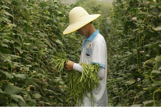 农场里,翠绿藤蔓缠绕支架,串串豇豆垂挂其间。实践队员们身穿统一服装,头戴草帽,手持皮筋,在农场主人的简单指导后,便满怀期待地踏入这片土地之中。