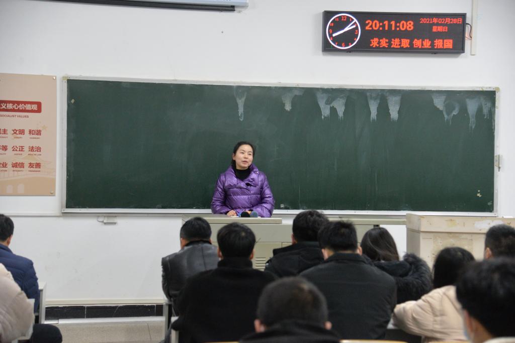 党委副书记谭亮魁从3个大方面细谈了2021年的员工工作构想。他告诉员工干部明确自己的工作,对接好自己的工作,构建工作体系,做到层层负责。随后,刘庆老师发言,他对征兵工作进行细致讲解,鼓励有参军意愿的同学们关注相关政策。接着,侯聪老师上台做了简单的自我介绍,首先她肯定了全体员工干部上学期的出色表现,对大家的辛勤付出表示感谢;其次,对近期分团委工作进行了动员和安排。林香亮老师为大家分析了刚开学员工的心理健康状态,鼓励同学们以阳光、乐观、积极的心态应对接下来的学习生活。最后 付雪娇老师强调了作为员工干部,我们要做好自己的职责工作,并告诉我们发扬“为民服务孺子牛、创新发展拓荒牛、艰苦奋斗老黄牛”的精神。
