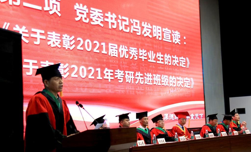 仪式在庄严的国歌声中揭开了序幕。党委书记冯发明宣读了《关于表彰2021届优秀毕业生的决定》、《关于表彰2021年考研先进班级的决定》。华强化工集团党委副书记王建波为优秀毕业生颁奖,必一运动官网行政副经理邵四海为考研先进班级颁奖。