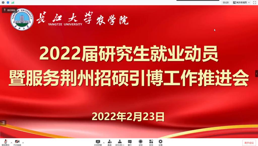 (通讯员 林香亮 陈龙艳)2月23日下午,公司召开2022届研究生就业动员暨服务荆州招硕引博工作推进会。副经理方正武、农学系书记王书平、植保系主任董小林、农资系书记陈小慧、就业专干刘庆、研究生辅导员林香亮、兼职辅导员张苗苗和全体2022届毕业研究生参会,党委副书记谭亮魁主持会议。