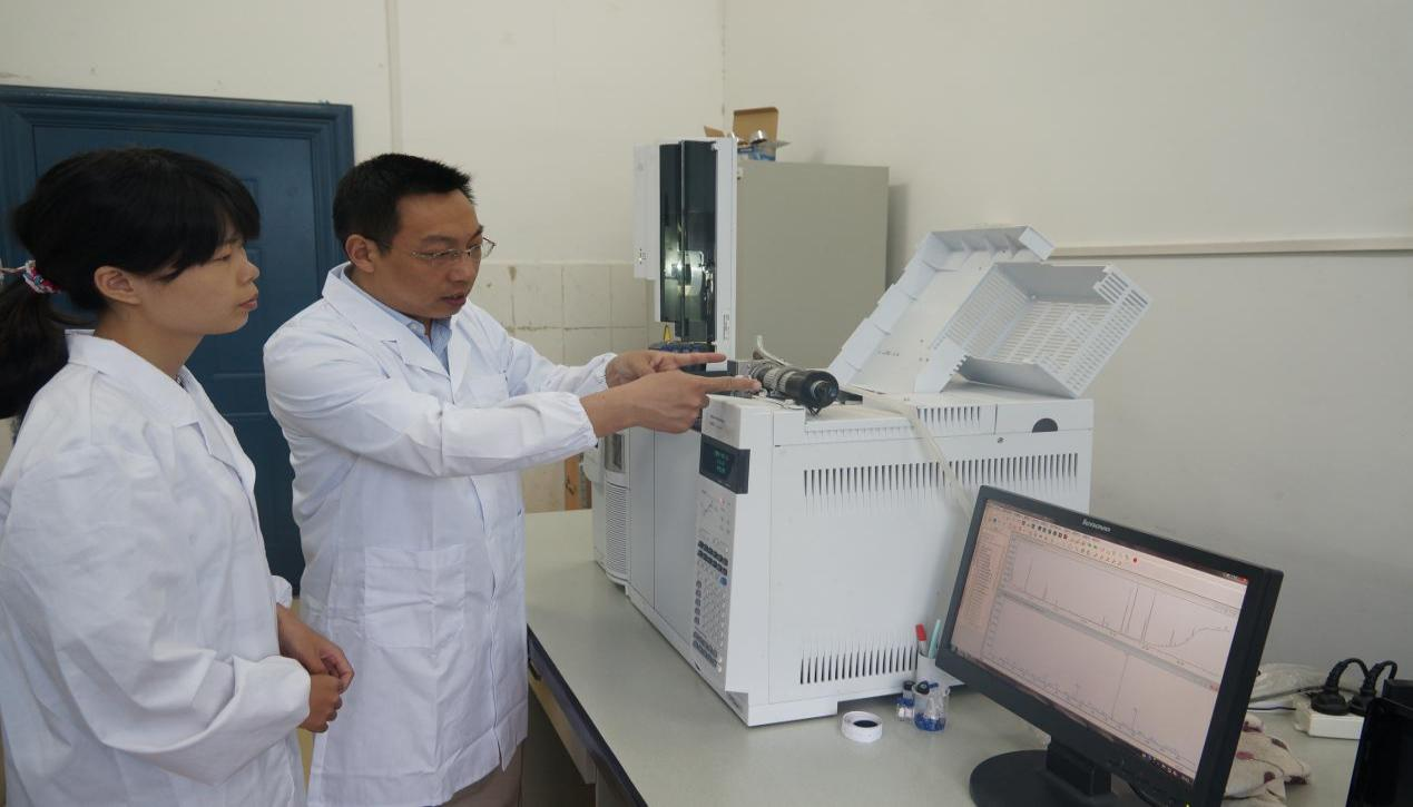 图为经理李俊凯教授在实验室指导研究生使用气象色谱质谱联用仪