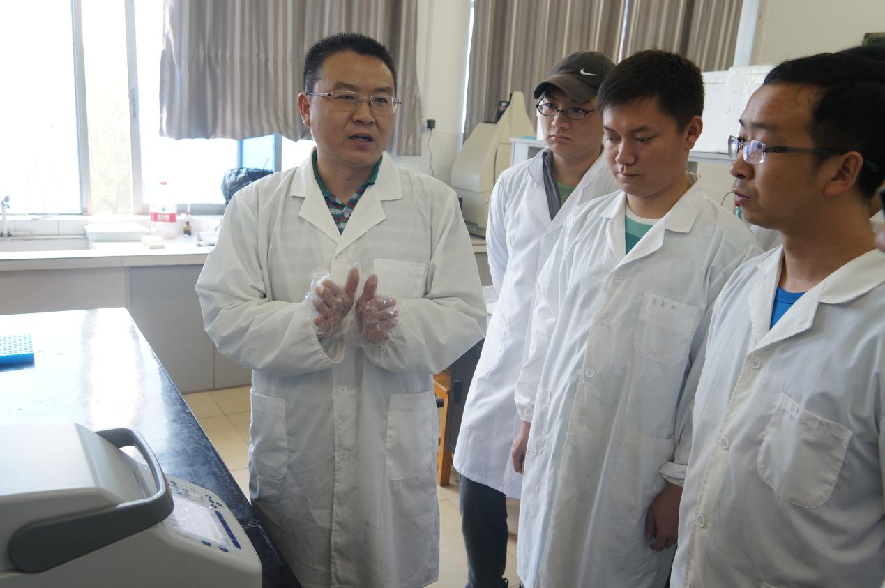 图为方守国教授在分子病毒学实验室指导博士生做实验