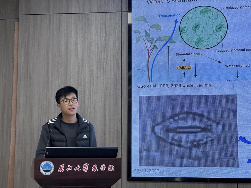 赵晨晨博士作了题为“Can stomata save the world”的学术报告,围绕植物气孔进化与环境适应性的关系开展研究,介绍自己多年来研究植物在干旱、盐胁迫、酸性土壤中气孔的适应性,重点介绍了PAP-SAL1逆行信号在植物应对非生物胁迫中的调节作用。