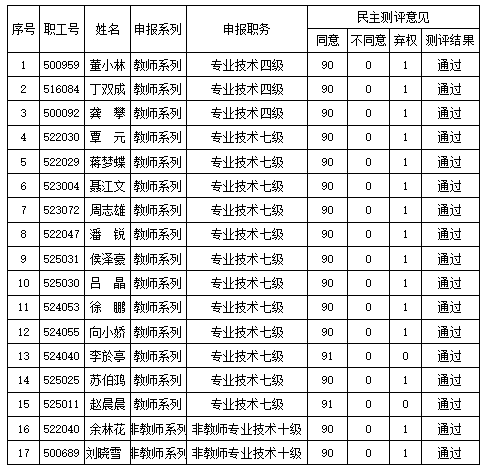 2025年10月9日下午召开2025年度职称评审民主测评会议,参加测评人员应到130人,实到91人,同意票达61票为通过;2025年10月10日线上开展赵晨晨职称评审民主测评,参加测评人员应到130人,实到130人,同意票达87票为通过,具体测评结果见下表。根据公司有关要求,进行结果公示。