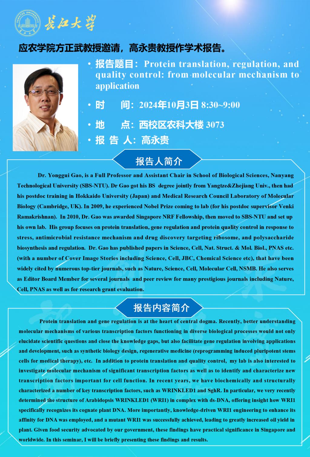 2024年学术报告(十五):Protein translation, regulation, and quality control: from molecular mechanism to application