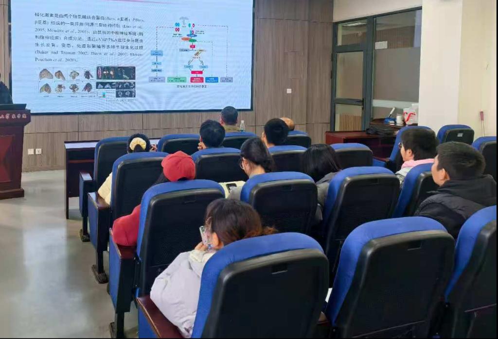 周志雄副教授介绍了鞣化激素调控桔小实蝇翅延展的分子机制,研究指出,鞣化激素通过调控翅发育相关基因的表达和信号通路的激活,影响翅的正常展开与成虫表型形成。然后结合分子生物学和功能验证实验,揭示了昆虫翅形成过程中的关键激素调控环节,是柑橘害虫发生机理解析及新型干预策略研发的重要理论依据。