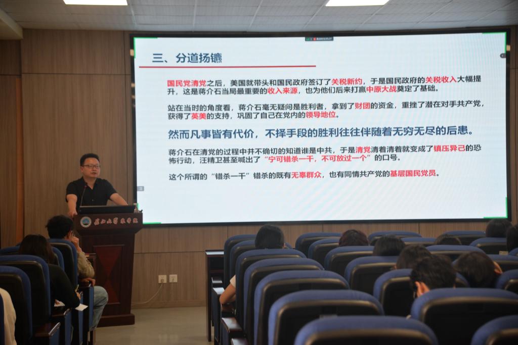 党委副书记尹小华进行了以《从党史的角度看党的伟大》为题的授课。回望“乱世英雄起四方,有枪就是草头王”的民国时期,尹书记教诲学员们要珍惜来之不易的和平生活;回望中共抗战、中国抗日胜利的艰辛历程,尹书记教诲学员们要继承热忱的爱国之情。他通过对比国民党与共产党面对严峻的国情做出的不同选择,印证了“中国共产党的领导是历史的选择、是人民的选择”这一结论。授课结束后,他激励学员们要做敢于担当、勇于奋斗、勤于实践、苦于锤炼的青年,坚定信念,不忘初心,端正入党动机,为强国建设、民族复兴贡献自己的绵薄之力。
