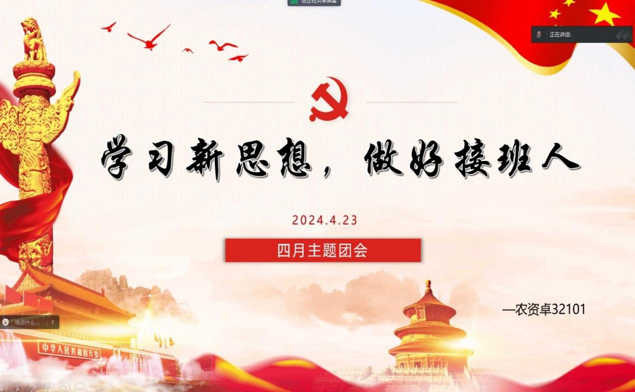 4月23日下午,农资卓32101支部在腾讯会议召开本次主题团会活动,主持人杨显华结合身边的典型事例,用小故事讲出大道理,深化爱国主义、集体主义、社会主义教育学习,鼓励大家积极融入生动的社会实践中去,传播正能量、弘扬主旋律,做社会主义核心价值观的倡导者和践行者。实践育人,支部也学习了习近平总书记关于科技创新的重要论述和指示批示精神,开展了国家安全教育日学习活动,同学们进行思考、讨论,在思辨中深刻理解航天精神,坚定青年人艰苦奋斗、勇于攀登高峰的精神。