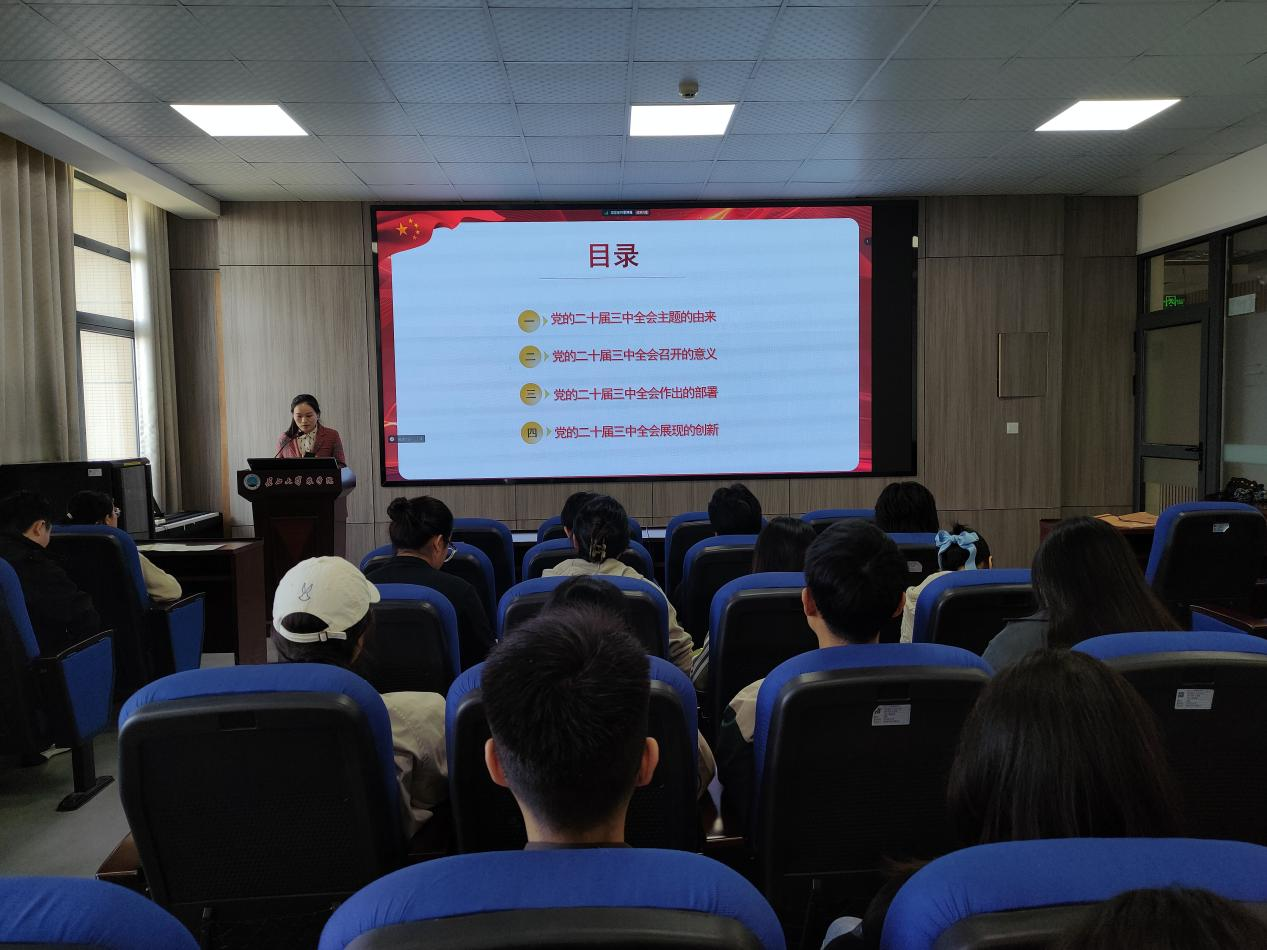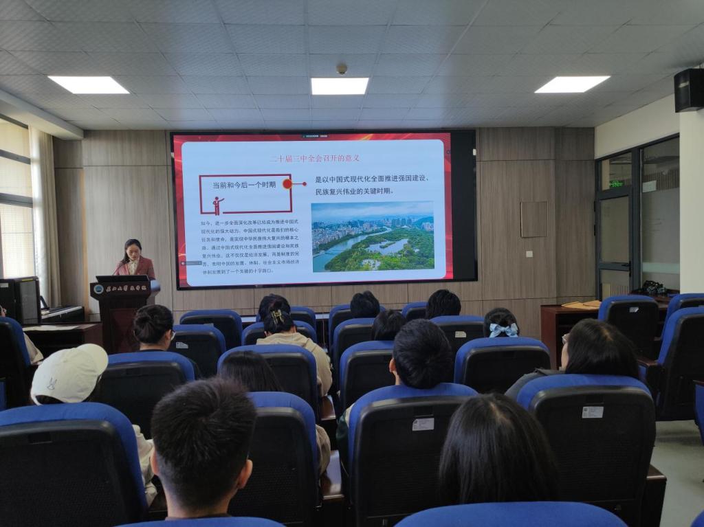 (通讯员 任娇 宋梦圆)为深入学习贯彻党的二十届三中全会精神,引导广大青年深刻领会全会精神,激发他们的责任感与使命感。10月23日,必一运动官网团委书记付雪娇在农科大楼3073会议室以“蹄疾步稳谋改革 勇毅笃行谱新篇”为题为80余名党员、积极分子上了一堂精彩的思政课。