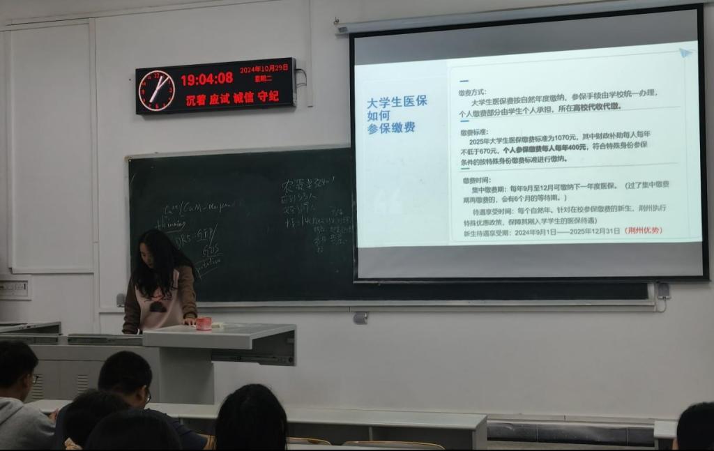 2024级辅导员唐玉婷用简洁准确的语言分别从“参保相关政策”、“老员工医保的参保与缴费”、“老员工医保待遇”、“参保的常见问题”4个方面向同学们进行讲解。其中着重讲解了“老员工如何参保缴费”、“老员工医保待遇”,让同学们了解到可以进行医保报销的情况、报销类别的选择、报销流程及一般报销比例等相关政策和知识。