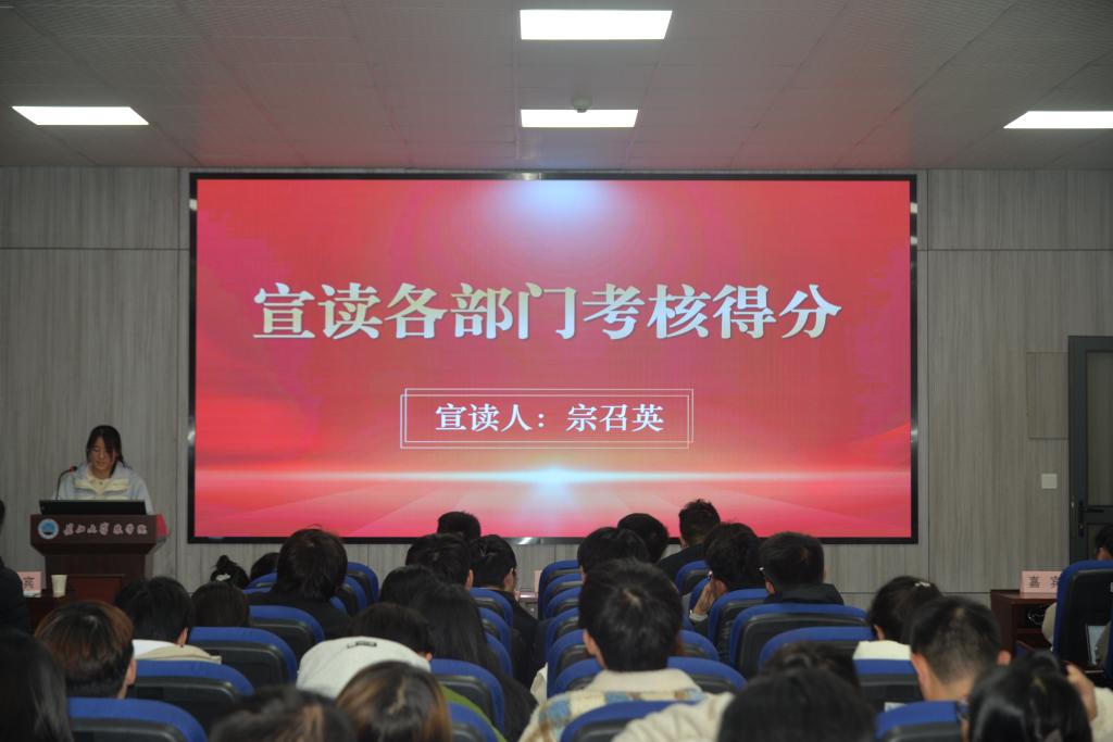 随后,宗召英同学宣读各部门考核得分,由学工办主任黄承石老师为优秀部长颁奖并合影留念。考核得分不仅是对工作的量化评价,也是对团队活动的肯定,员工会考核制度意在通过考核提升各部门综合能力,增强同学们的工作热情。