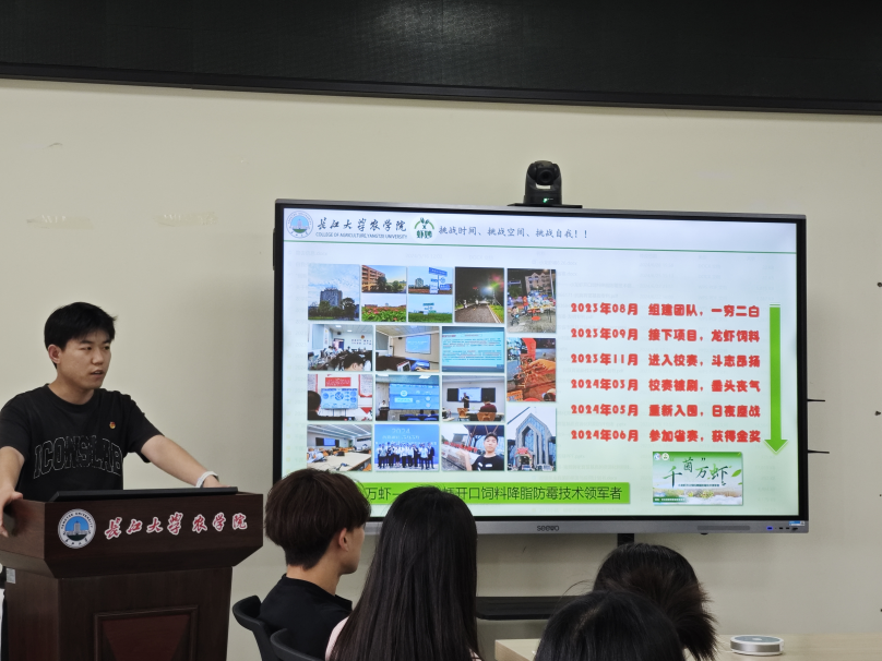 活动特邀2023年“挑战杯”国家级获奖团队负责人史庆潇作经验分享。其团队项目《千“菌”万虾——小龙虾开口饲料降脂防霉技术领军者》历时10个月攻关(2023年8月至2024年6月),突破传统饲料配方瓶颈。史庆潇以“挑战时间、挑战空间、挑战自我”三个关键词,讲述如何平衡学业与科研、突破实验室条件限制、直面挫折重塑信心的心路历程,激励团干“敢闯会创、勇攀高峰”。