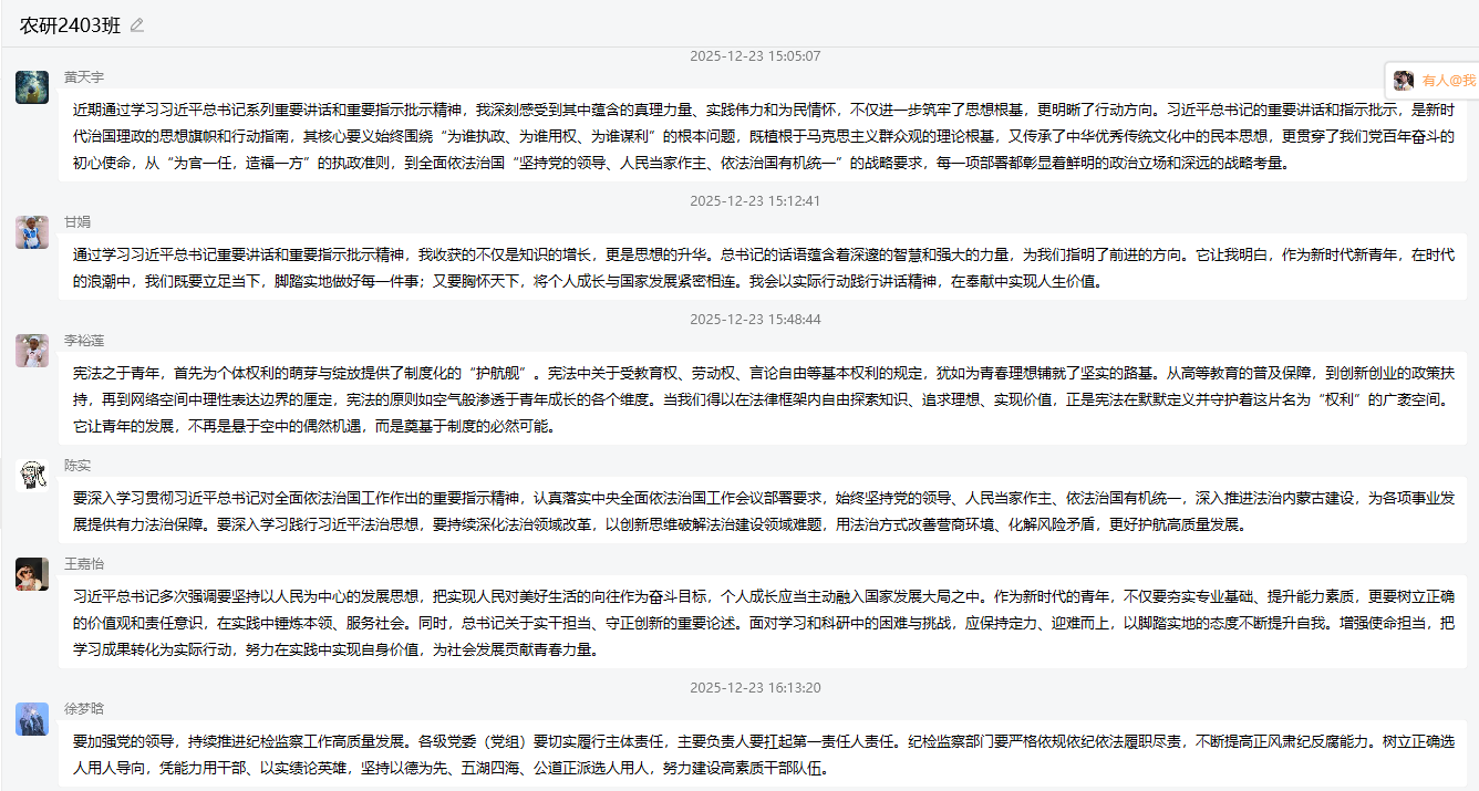 活动中,各团支部聚焦学习重点,掀起理论学习热潮,全体研究生深入研读了习近平总书记系列重要讲话和重要指示批示精神,包括在中共中央举行纪念胡耀邦同志诞辰110周年座谈会上的讲话、对全面依法治国工作作出的重要指示、在听取海南自由贸易港建设工作汇报时的重要讲话等,深刻领会新思想、新论断、新要求。同时,同学们认真学习了《求是》杂志发表的习近平总书记重要文章《推进党的自我革命要做到“五个进一步到位”》和《因地制宜发展新质生产力》,从中进一步把握了中国共产党人忠诚于党、心系人民、求真务实的精神品格,深刻认识了以自我革命引领时代发展、以科技创新培育新质生产力的时代内涵。此外,大家还学习了《中共必一运动官方网站委员会关于深入学习宣传贯彻党的二十届四中全会精神的通知》,研读了《习近平谈治国理政》第五卷第十一章《推进国家安全体系和能力现代化》相关内容,并回顾了习近平总书记在浙江工作期间关于意识形态工作的重要论述及实践探索。