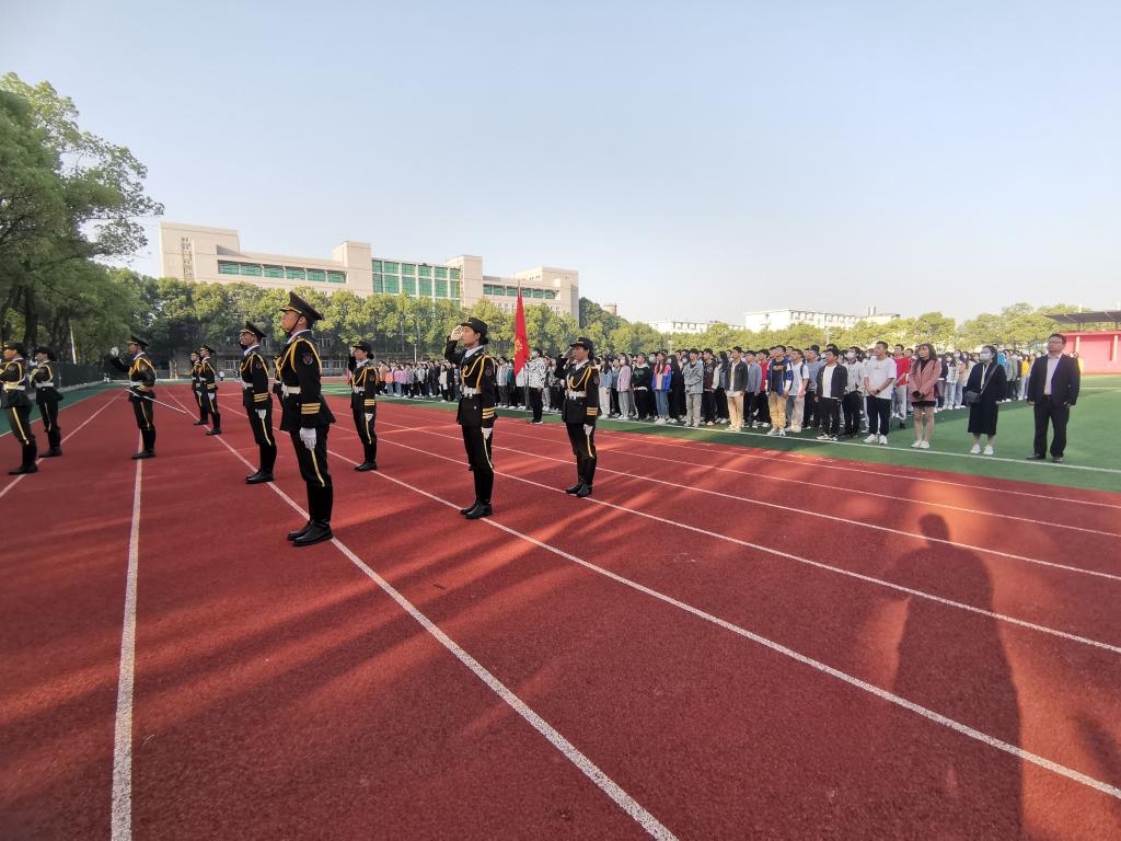 伴随着振奋人心的国歌响起,国旗护卫队踏着整齐响亮的步伐出旗,他们的庄严令人肃然起敬。全场师生齐唱国歌,向国旗行瞩目礼。