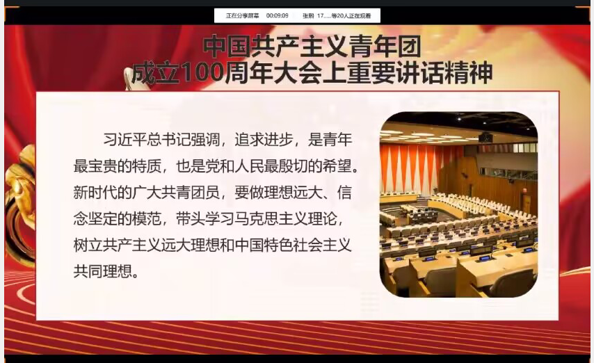 农资卓32001班共青团员杨添雨在10月21日下午带领同学们于QQ会议上开展了本次团会。此次活动中,同学们深学细悟习近平总书记在庆祝中国共产主义青年团成立100周年大会上的重要讲话精神。讲话全面回顾一百年来共青团坚定不移听党话、跟党走的青春历程,充分肯定共青团在党的领导下、团结带领一代代团员青年为实现中华民族伟大复兴中国梦所作出的重要贡献。本次活动更是让该班员工了解到青年应发扬党不怕困难、勇于自我革命的精神,赓续红色血脉,把青春奋斗融入党和人民事业,甘于做一颗永不生锈的螺丝钉;要做崇德向善、严守纪律的模范,带头明大德、守公德、严私德,严格遵纪守法,严格履行团员义务。