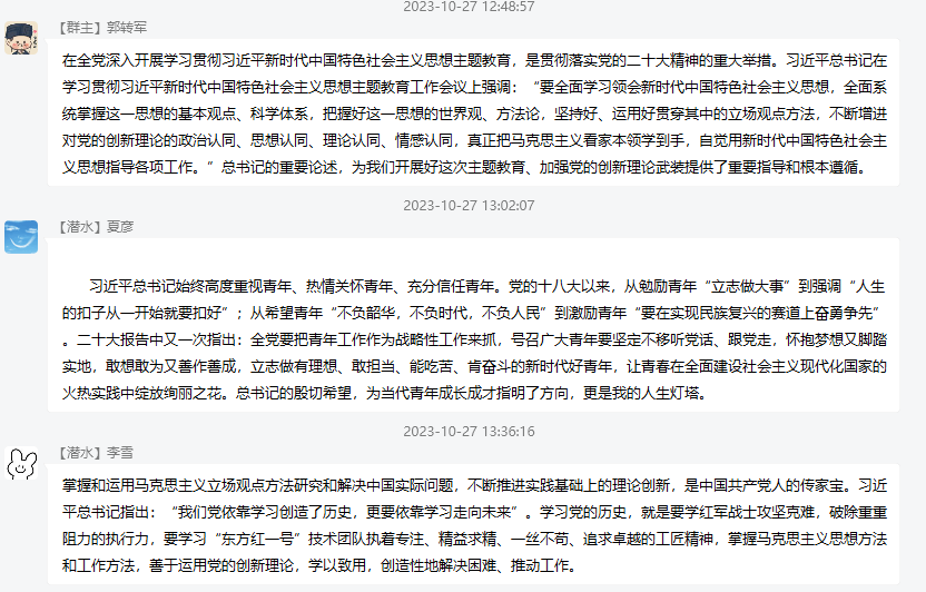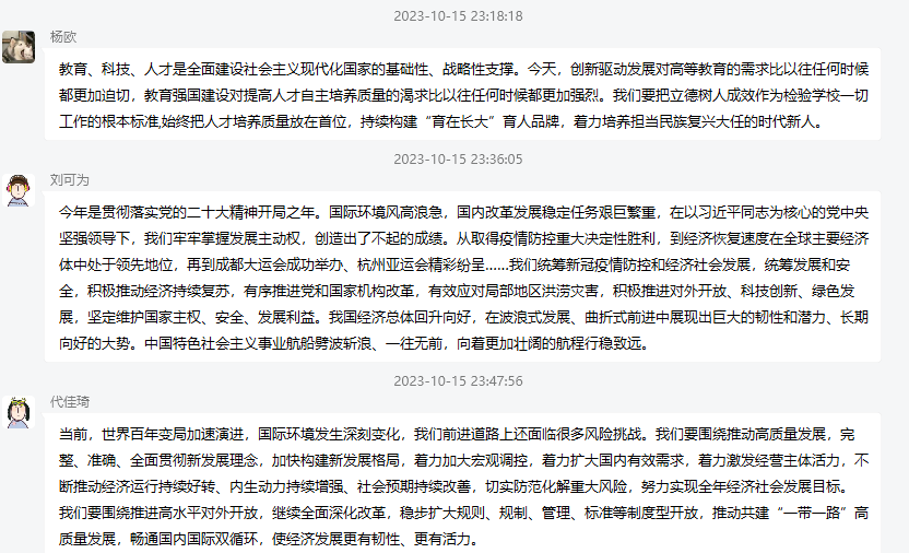 各班级集中学习了“习近平总书记关于庆祝中华人民共和国成立74周年招待会发表的重要讲话”、“习近平总书记发表的重要文章《扎实推动教育强国建设》”、“习近平总书记给全国优秀教师代表、国防科技大学建校70周年以及2023北京文化论坛的致信”、“董事长刘勇胜在公司合并组建20周年暨高水平大学建设主题大会上的主题报告”等内容。