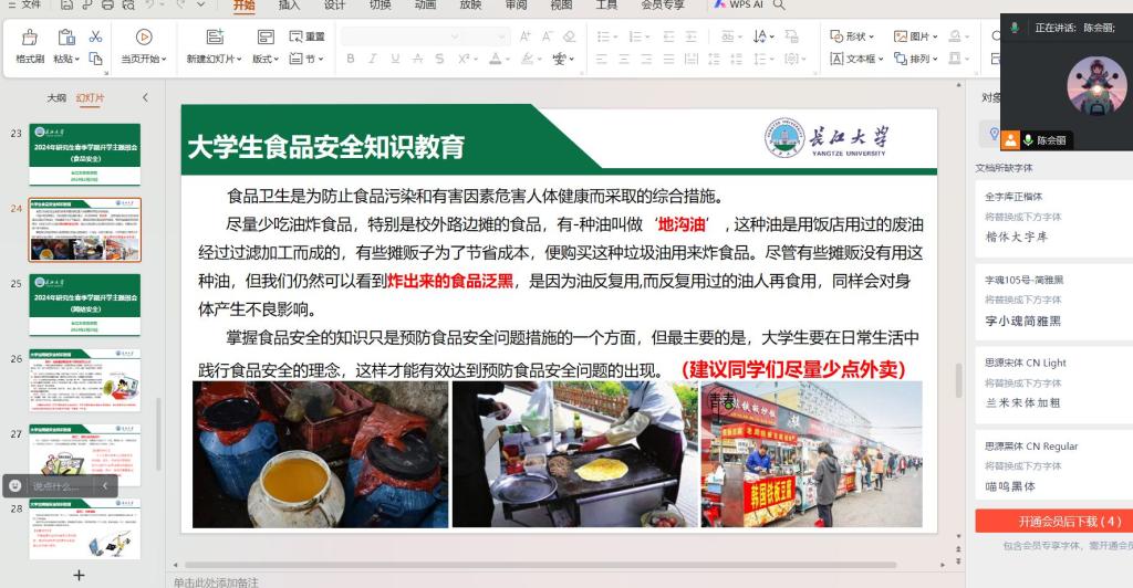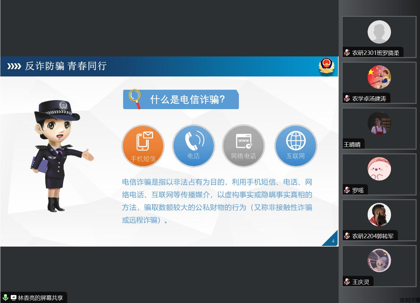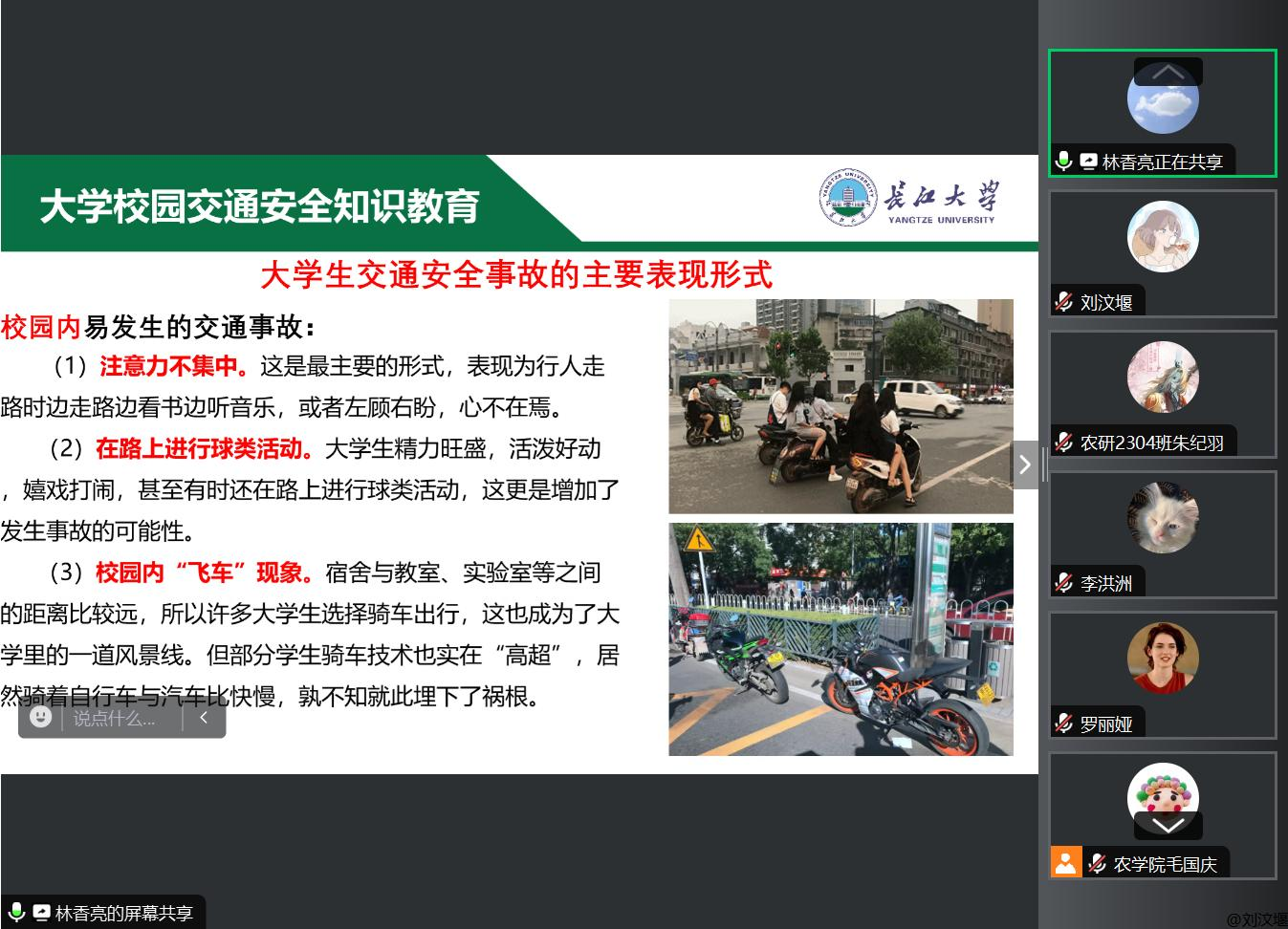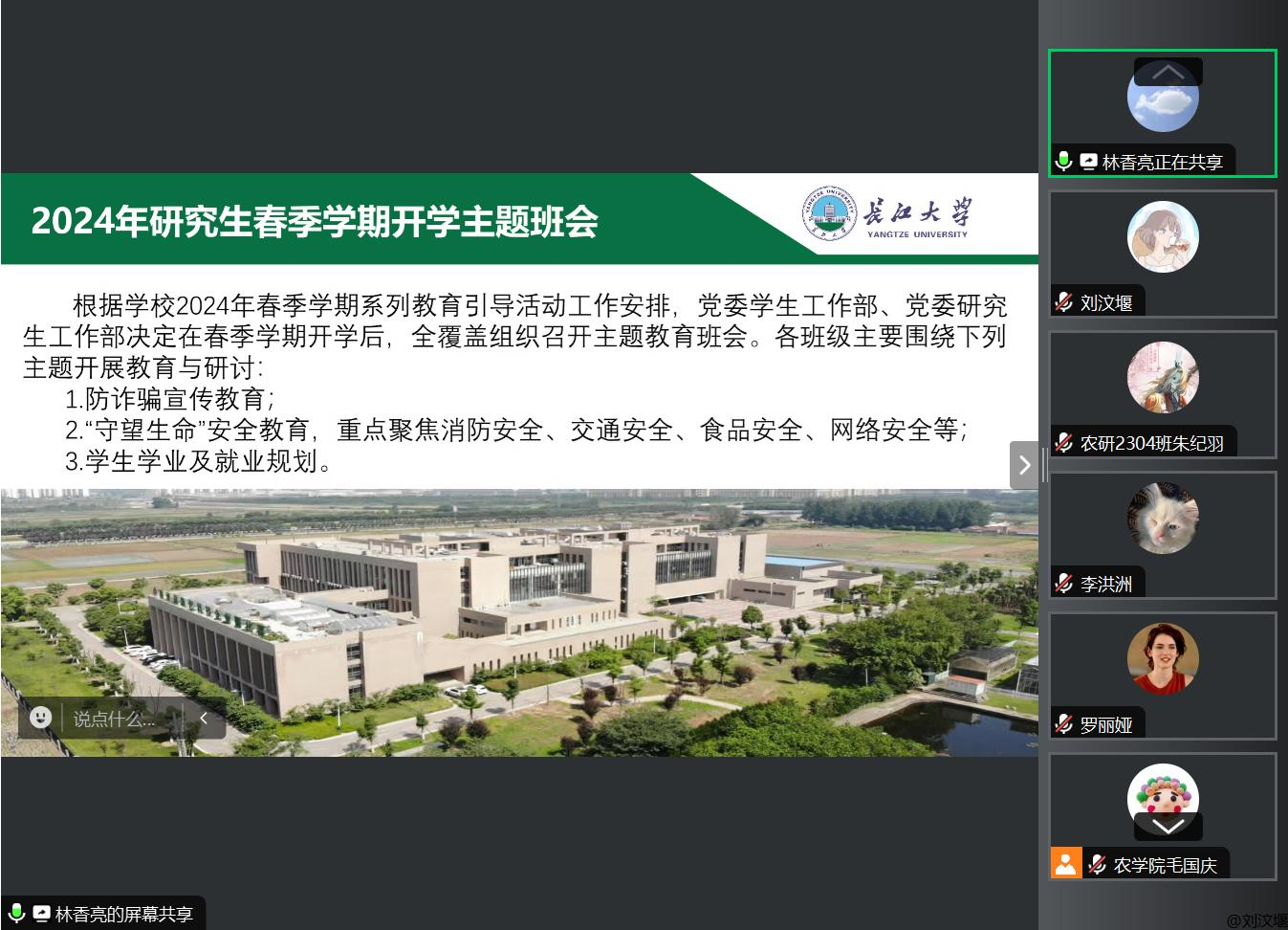 研究生辅导员林香亮强调,新学期各班级要摸清底数,全面掌握研究生的返校情况以及联培研究生的具体人数,全面谋划安全教育工作。开学初,各班级要系统推进防诈骗、生命教育、消防安全、网络安全、交通安全、食品安全等常态化安全教育,公司将会通过员工干部会议、班会、下宿舍、进实验室等多种形式系统开展安全教育。