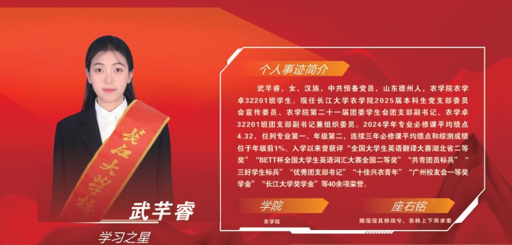 “长大学农,大有作为”不仅是口号,更是武芊睿奋斗的方向。未来,她将继续以科技创新为驱动,以服务“三农”为己任,在“厚德笃行,丰实天下”的道路上砥砺前行,用青春与热血书写新时代农科学子“强农兴农”的壮丽篇章!