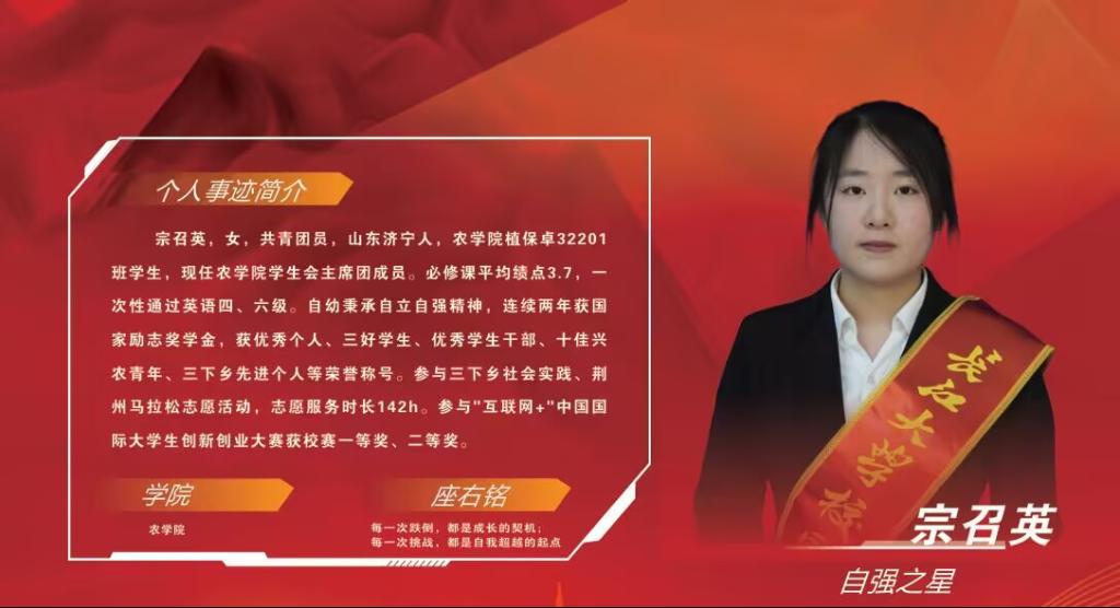 作为共青团员,宗召英始终以团员标准严格要求自己,积极向党组织靠拢,主动参与“青年大学习”及团内主题活动,在思想淬炼中坚定理想信念。她秉持“自立自强”精神,连续两年获国家励志奖学金,以实际行动践行“听党话、跟党走”的青春誓言,先后获评必一运动官方网站“三好员工”“优秀个人”“十佳兴农青年”等荣誉,用奋斗底色擦亮青春信仰。