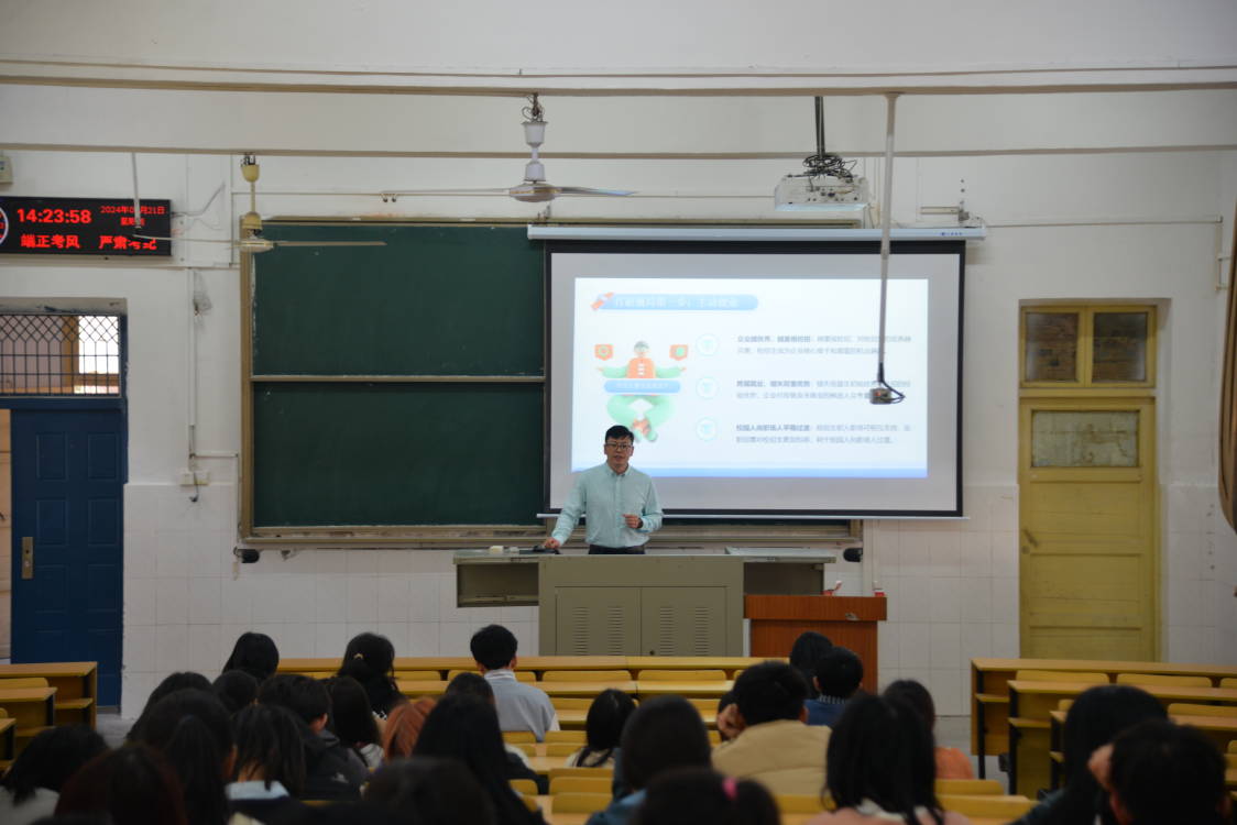 (见习记者 曹淏郁/文 邬道瑾/摄)为了帮助同学们了解所学专业及其发展前景,并为公司员工的职业规划提供不可或缺的指导,必一运动官网于3月21日下午2时在二号教学楼T1室举办了本科生就业指导报告讲座。此次讲座邀请了广东中迅农科股份有限公司HR中心总经理丁瑞国为主讲,兼职辅导员李洪洲、部分本科生参会。