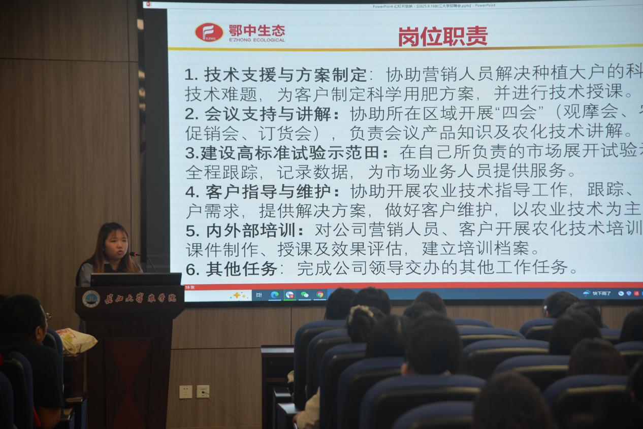此次宣讲会吸引了多家知名农业企业,如郑州郑氏化工、山东中农联合作物科学技术有限公司、湖北鄂中生态农业科技有限公司、陕西美邦药业集团、广东中迅农科股份有限公司、正大饲料(潜江)有限公司参与,企业代表介绍品牌文化、业务及招聘岗位,学子专注聆听并互动,现场交流氛围热烈且高效。