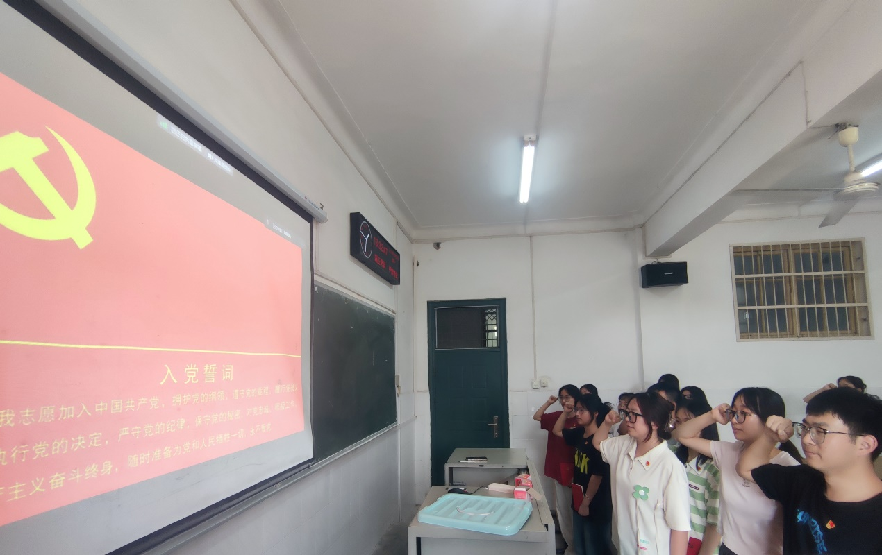 大会严格按照接收预备党员的组织程序进行。会议上,13名发展对象依次宣读《入党志愿书》,从思想、学习、工作、生活、入党动机等多个方面向党组织汇报自身情况。入党介绍人介绍发展对象的培养考察情况并表明自己的意见和态度。发言完毕,正式党员以无记名投票的方式对这13位发展对象能否成为预备党员进行表决。共发放表决票17张,收回表决票17张。最终,李慧明等13名同志均投票通过,成为了新发展的预备党员。新发展的预备党员在组织委员曾袁琳珺同志的带领下,面向党旗,庄严宣誓。