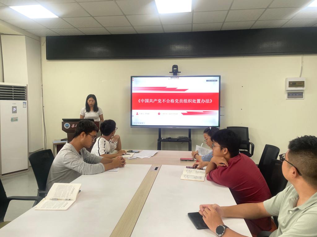 支部副书记唐海洋带领全体党员重温入党誓词;纪检委员罗丽娅对本月党费收缴情况进行简要说明;党员廖慧英带领全体党员学习《中国共产党章程》;党员王澎、罗丽娅、王荣森领学党的创新理论;党员郝梨、徐志鹏、李艺德结合生活和学习经历,以“如何把党的二十届三中全会精神转化为推动特色高水平大学建设的具体举措和生动实践”为题开展集中研讨交流。