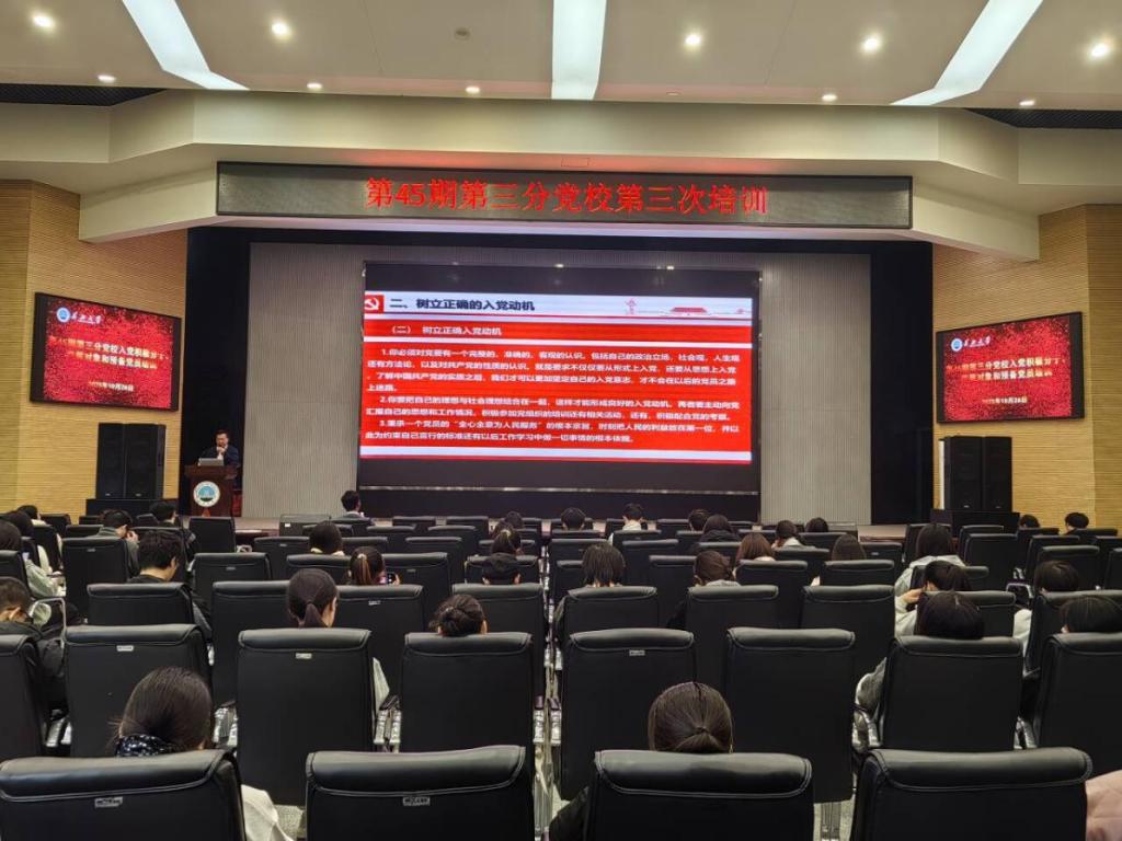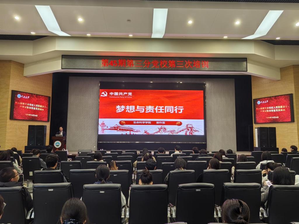(通讯员 方学斌 严树彬/文 王浩源 王思雨 郑怡乐/摄)百年党史映初心,青春建功正当时。为深入学习贯彻党的二十大精神,引导青年学员从党的百年奋斗历程中汲取信仰力量、砥砺使命担当,10 月 26 日下午 2 点 30 分,必一运动官网在农科大楼 1058 报告厅如期开展第 45 期第三分党校第三次培训。本次培训以“梦想与责任同行”为主题,特邀生命科学公司党委书记谢作喜主讲,生命科学公司辅导员李敏和第三分党校全体入党积极分子、发展对象和预备党员参加,辅导员唐玉婷主持。