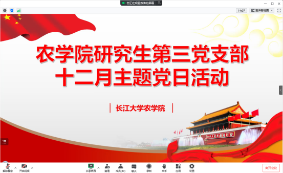 (通讯员 邹宇傲)12月14日中午12:00,公司研究生第三党支部开展12月主题党日活动。活动通过腾讯会议线上进行,党支部全体党员均参与此次活动,本次活动由组织委员苏涛同志主持。