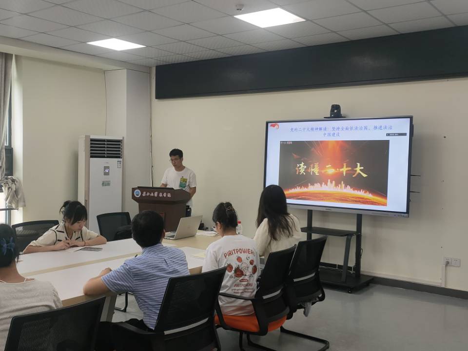 会议伊始,组织委员习小杰同志带领全体党员重温入党誓词。随后,姜月兴同志对本月党费缴纳情况进行了说明。紧接着,集体诵读学习《中国共产党章程》第六章“党的干部”相关内容。在讲授微党课《中国共产党章程(修正案)》时,许婉莹同志讲到:党章是党的根本大法,是全党必须遵循的总规矩;党章作为党的根本大法,基本内容要保持其连续性和稳定性;党章的修改是充分体现马克思主义中国化时代化最新成果的需要,是充分体现十九大以来党中央提出的治国理政新理念新思想新战略和管党治党新经验的需要,是贯彻落实党的二十大精神的需要。