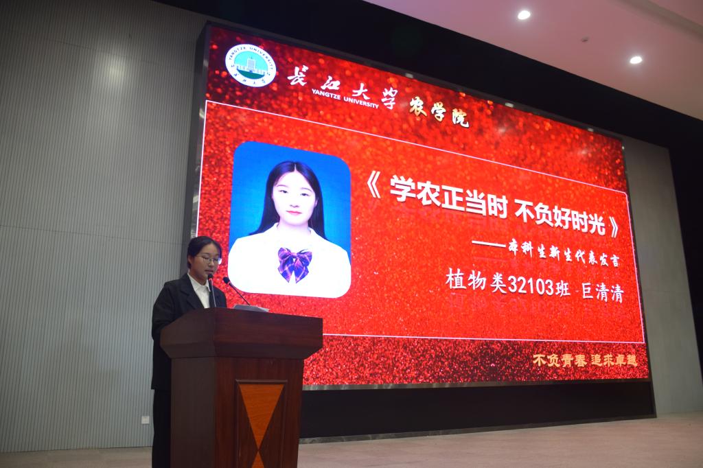 植物类32103班巨清清和农研2104班贾艺泉同学分别作为本科生和研究生新生代表发言。她们对开学时老师同学们的辛苦付出以及入学后公司无微不至的关怀表示衷心的感谢,表达了对老员工活的期待与憧憬,呼吁全体新生要有勤学躬行的决心,坚韧不拔的毅力,敏而好学的热情,脚踏实地的实践力。贾艺泉同学提到当今社会智慧农业是摆在我们面前的新课题,我们所有学农人需要坚定目标、积累知识为探索未知提供路径。