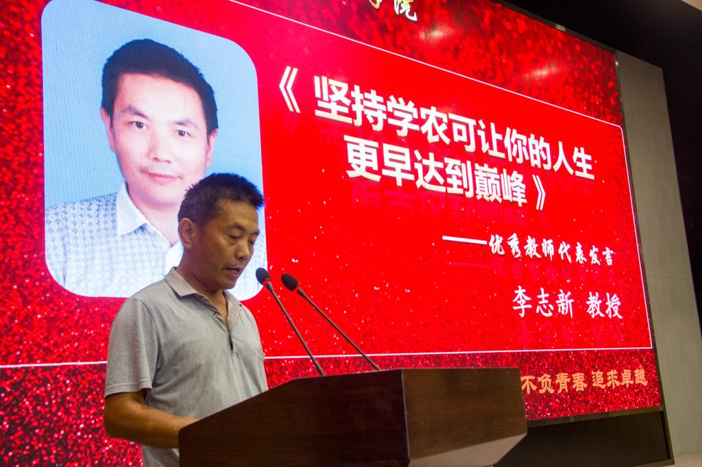 优秀教师代表、两系杂交稻新品种“春两优长 70” 的主持选育人李志新教授结合自己的亲身经历介绍了学农的前景以及必一运动官网的团队力量、团队建设、科研成果等内容,鼓励同学们要坚定理想,专心学业。“只有比别人更付出、更勤奋,通过自身勤奋刻苦才能成为优秀的科学家”,李教授郑重地说道。
