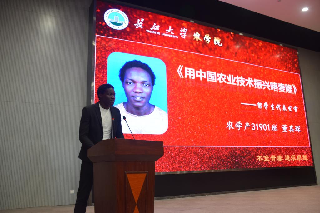 “我不能忘记那些每天吃不饱饭的孩子,我希望以后能帮助实现解决饥饿。”职工代表,来自喀麦隆的董其琛 Pavel 同学讲述着自己来到长大学农的初心,并勉励在场所有同学能够为了家人、老师更为了自己,能好好学习努力拼搏,实现自己心中的农业理想。
