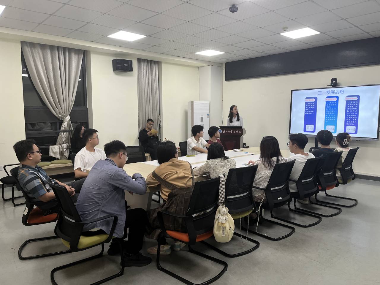 本次比赛共有5支队伍参加,他们的项目主题主要涵盖科技创新和未来产业及乡村振兴等方面。比赛伊始,侯聪向选手们科普比赛的相关知识,告知此次比赛的重要性,呼吁同学们把握好此次机会,认真对待。比赛开始后,各项目负责人依次从产业背景、科研重点、经济效益及未来展望等方面依次进行答辩。洪亮的声音,清晰的讲解,生动形象的图片,展现了当代老员工独特的创新思维与朝气蓬勃的精神风貌。最后,评委老师们对参赛选手优秀的项目以及辛勤的付出给予了肯定与表扬,同时也对其中存在的问题进行指正。选手们的疑惑,评委老师也一一给予了详细的解答,并给出更好的解决方案。