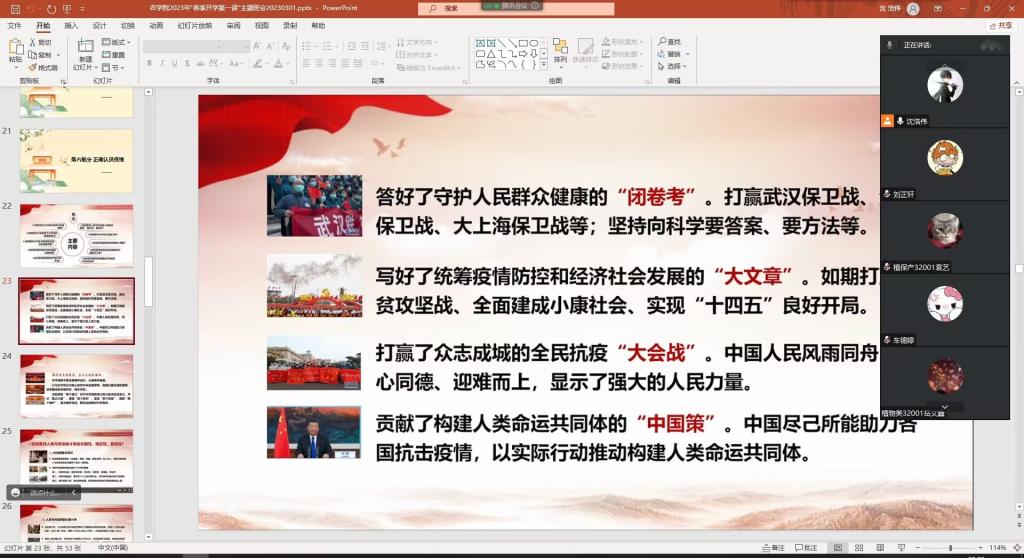 最后,老师带领员工回顾这场刚吹响胜利号角的疫情战争,突出展示了老员工在疫情当中体现出来的青春与担当,正确认识这场疫情背后所体现出来的伟大抗疫精神,呼吁员工们树立正确的人生观价值观,寻找属于自己的舞台,展示属于自己的青春,接续“长江后浪推前浪”的劲,挑起时代赋予的重担。
