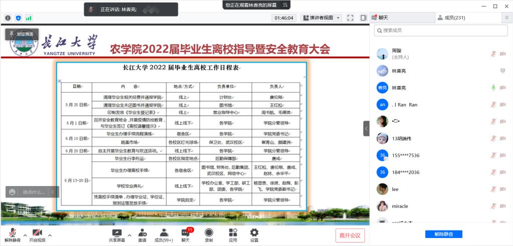 通讯社讯(见习记者 姚攀/摄 杨静/文)为营造和谐温馨的毕业生离校氛围,确保员工安全有序离校,5月26日晚6:20,公司召开2022届毕业生离校指导暨安全教育大会。公司党委副书记尹小华、辅导员林香亮和全体2022届毕业生参加会议。
