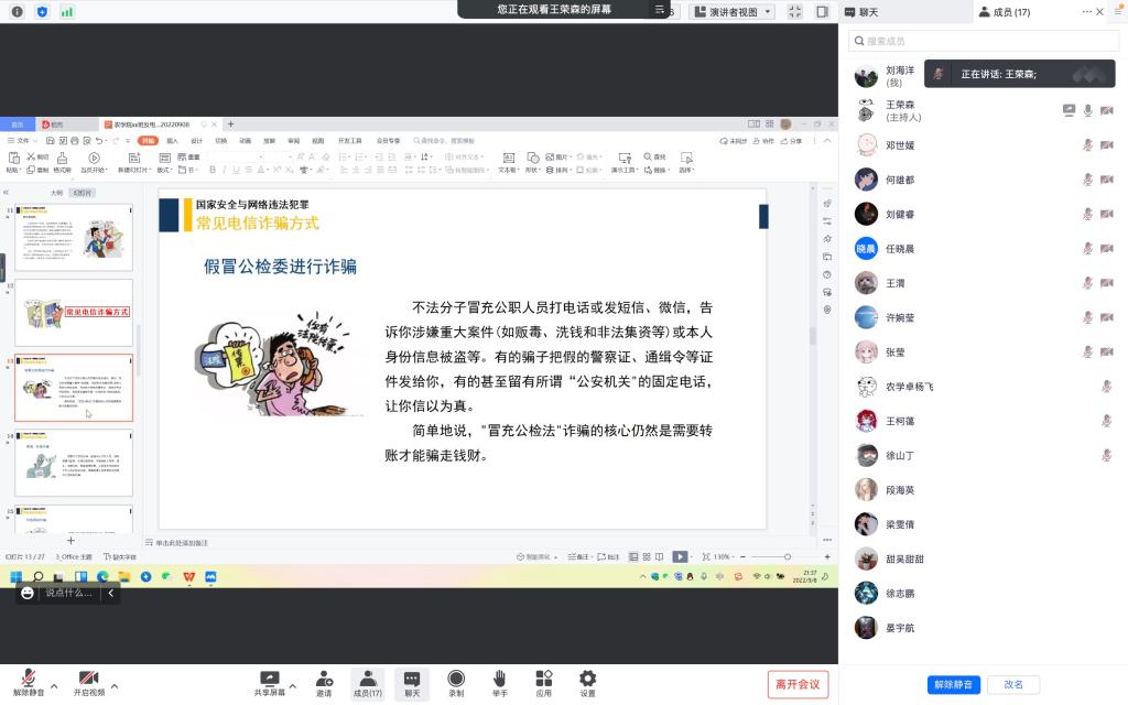 (通讯员 李雅倩)为提高同学们的防诈骗意识,提升大家对网络诈骗的识别和应对能力,促进平安校园建设,近日公司各班级开展了以防电信诈骗为主题的线上安全教育班会。