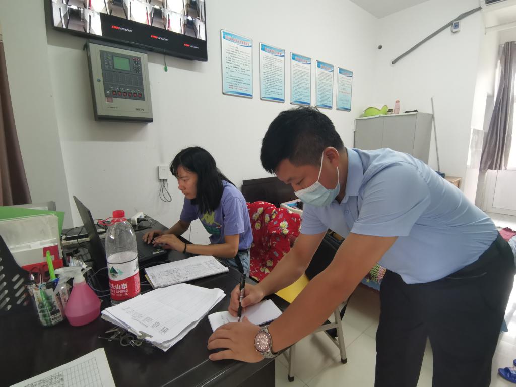 在里仁堂研究生宿舍区,党委副书记谭亮魁查阅了门房员工出入记录,与楼管员沟通疫情期间员工安全管理措施以及前期员工反应的相关问题。
