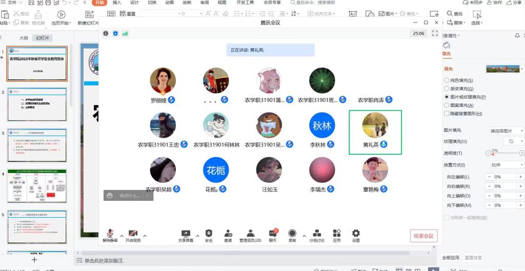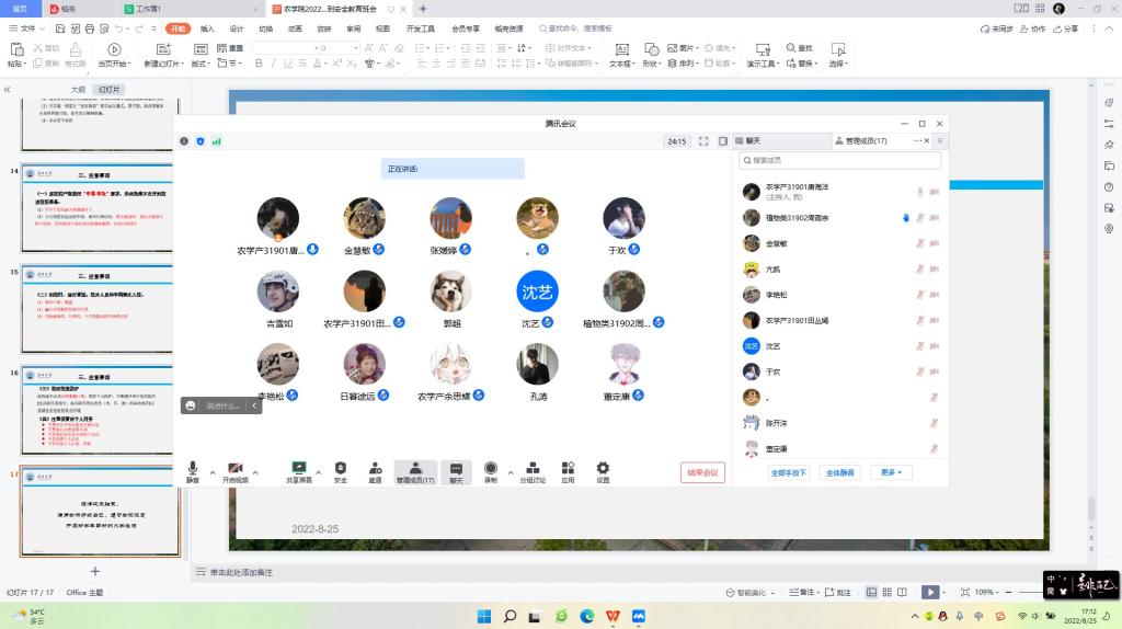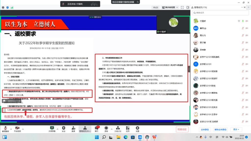 (通讯员 郝梨)为了保证员工能够安全、顺利返校,8月22日—25日,农公司采用腾讯会议分年级分班级在全院员工中召开了2022年秋季员工返校工作年级大会,会议由各年级辅导员和各班级班主任主持。